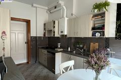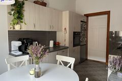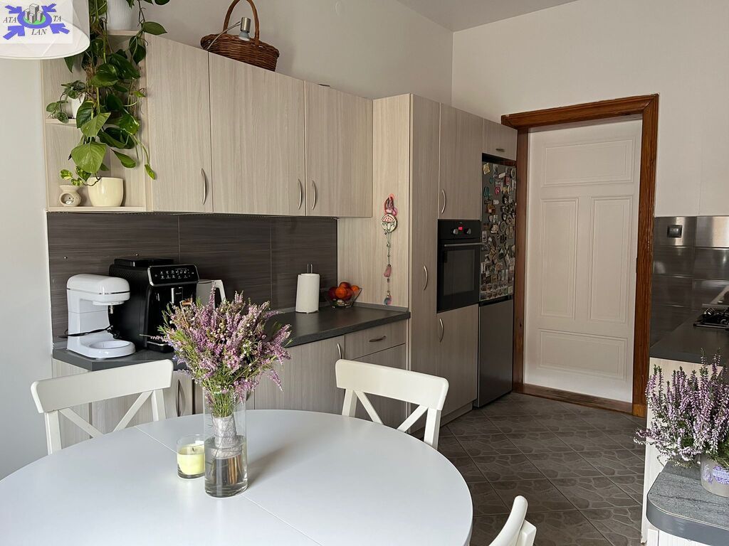 - Duża kuchnia z oknem, w ładnej zabudowie szafkami kuchennymi i sprzętem agd (płyta gazowa, piekarnik, zmywarka do naczyń). W pomieszczeniu mieści się duży stół jadalny z 4 krzesłami
