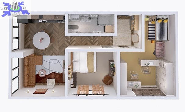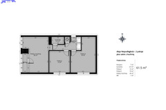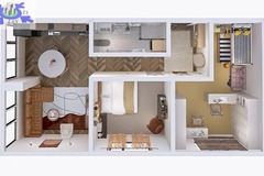 * W ogłoszeniu użyto poglądowych wizualizacji mających na celu zaprezentowanie potencjału aranżacyjnego mieszkania po remoncie - wg rzutu pokazującego układ salon z aneksem oraz 2 sypialnie.