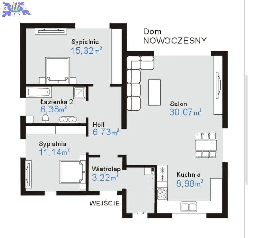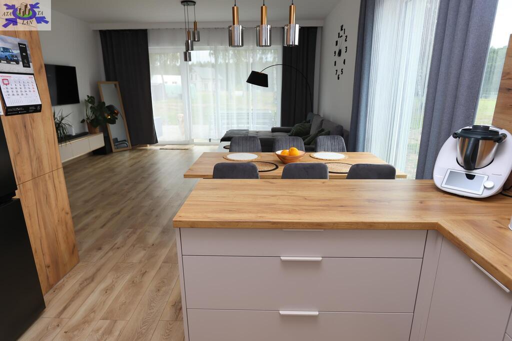 - salon (z wyjściem na taras) oraz otwarta kuchnia,