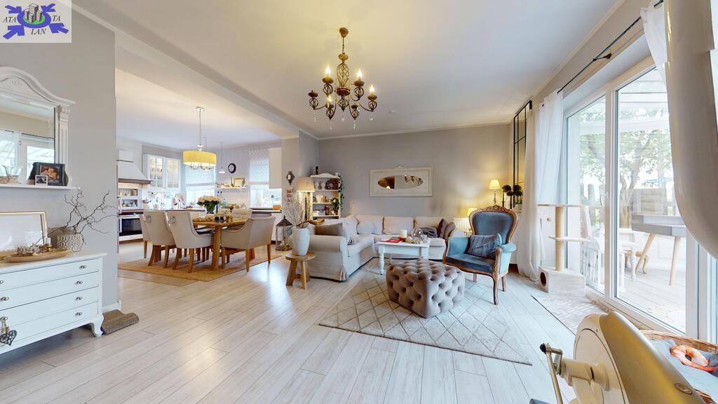 - przestronnego salonu z otwartą kuchnią, z wyjściem na taras zimowy,