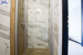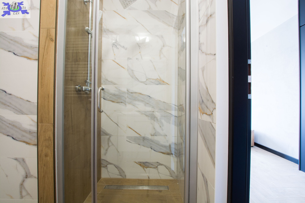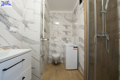 Łazienka wyposażona jest w dużą kabinę prysznicową, szafkę z umywalką, duże lustro, toaletę i pralkę.