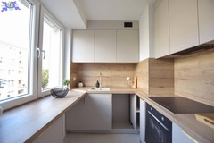 Podczas remontu wymieniono instalacje elektryczne i wodno-kanalizacyjne, położono nowe podłogi i gładzie, dzięki czemu mieszkanie nie wymaga żadnych dodatkowych nakładów. Kuchnia z zabudową wykonaną przez stolarza na wymiar.