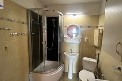 Na podłodze panele i kafle, na ścianach tapeta. Łazienka z kabiną prysznicową wykończona w glazurze i terakocie.