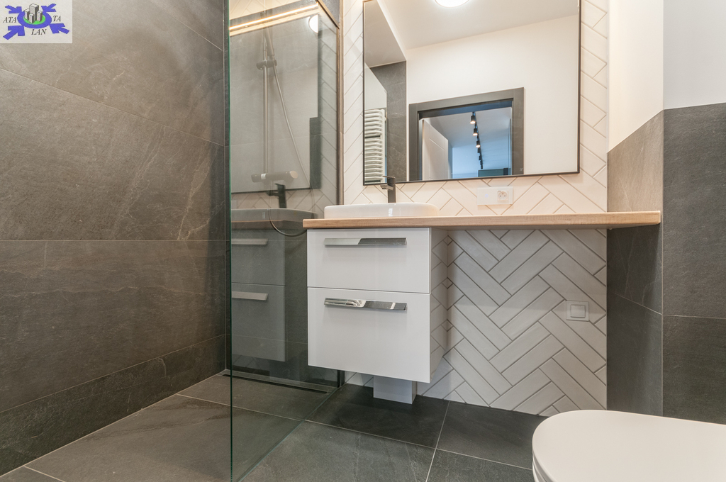 * łazienka wykończona w kaflach, z kabina prysznicową typu walk-in zabudowany geberit, szafka z umywalką,