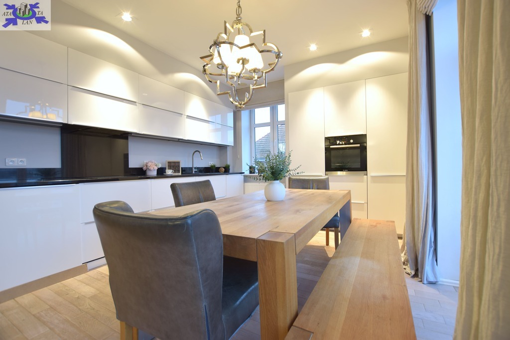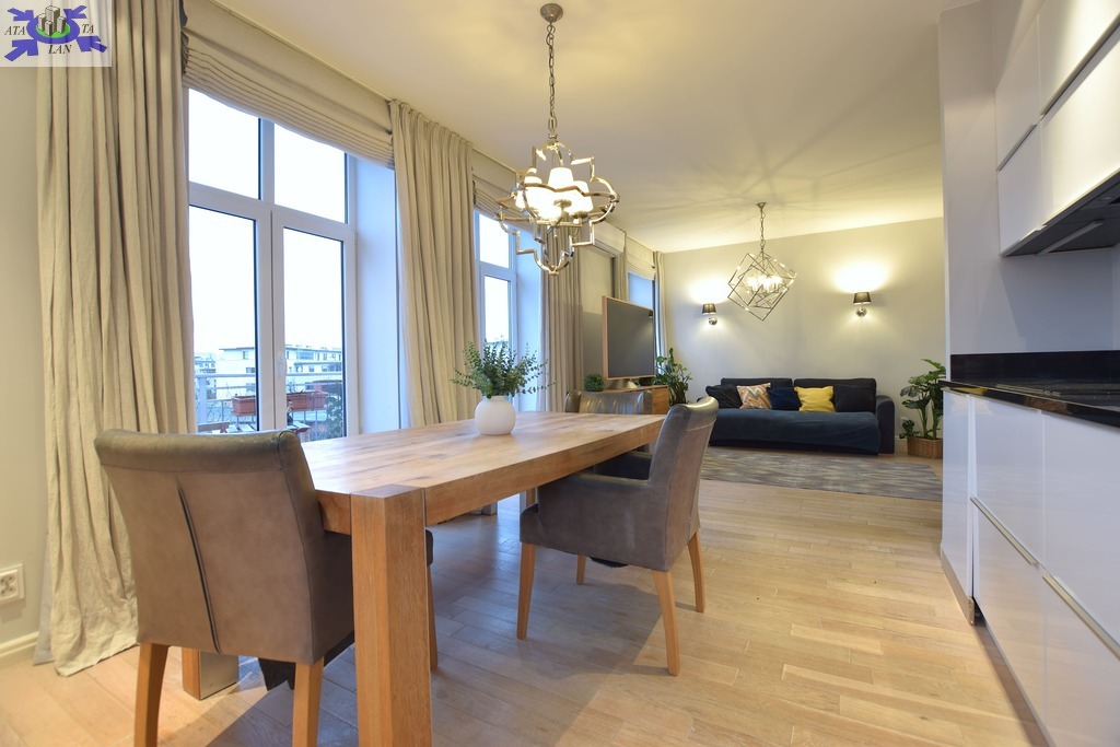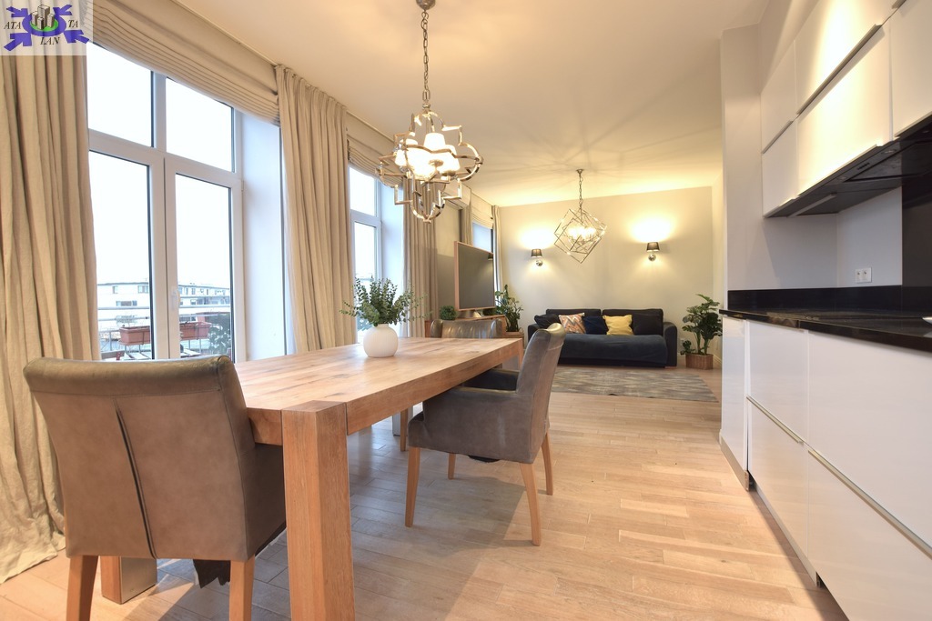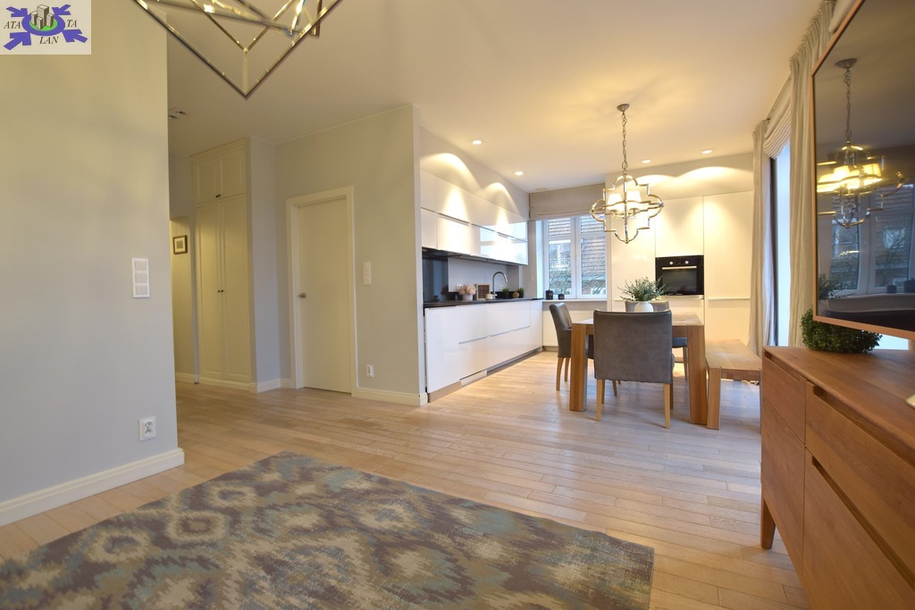 Salon połączony z kuchnią o powierzchni około 30m2 z wyjściem na słoneczny balkon.