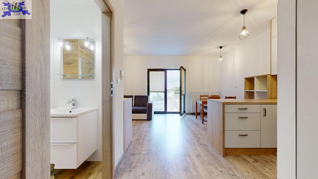 Pokój z aneksem kuchennym i wyjściem na balkon. Łazienka razem z wc, w przedpokoju szafa w zabudowie.