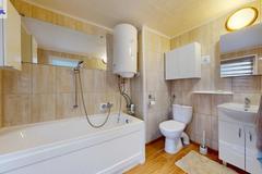 Na parterze znajdują się dwa oddzielne mieszkania ze wspólną drewnianą werandą, w każdym z nich przedpokój, sypialnia, przestronny pokój dzienny, kuchnia, łazienka, dodatkowy pokój.
