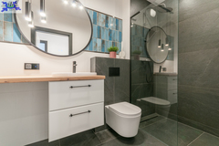 * łazienka wykończona w kaflach, z kabina prysznicową typu walk-in zabudowany geberit, szafka z umywalką,
