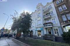 Nieruchomość znajduje się na parterze kamienicy ze zrobioną i zadbaną elewacją.