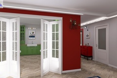 Przy obecnym układzie mamy klasyczny, duży przedpokój z którego wchodzi się do łazienki, kuchni, salonu i trzech sypialni, przy czym ta położona obok salonu jest przechodnia (piękne, duże, drewniane drzwi prowadzą do salonu). Jest wiele możliwości aranżacji pomieszczeń - w przykładowej wizualizacji wykorzystano koncepcję w której kuchnia zostaje przeniesiona właśnie do tej sypialni otwierając się na salon.