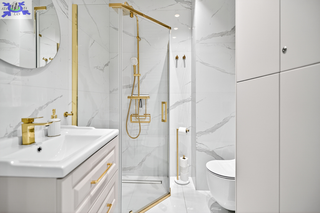 elegancką łazienkę z prysznicem,