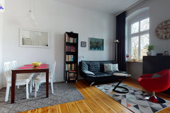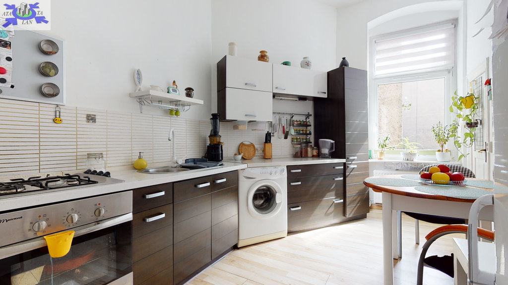 - łazienka - po generalnym remoncie, z dużym oknem, położona odrobinę ponad poziomem całego mieszkania, dlatego wchodzimy do niej po oryginalnych drewnianych schodach.