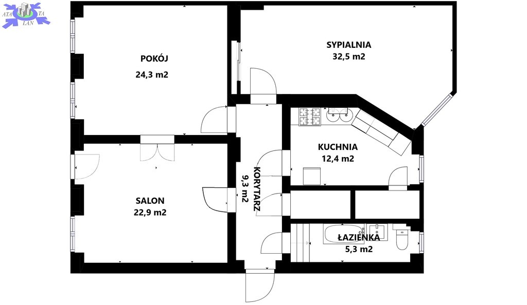 - trzy duże pokoje - wszystkie powiązane w układzie amfiladowym, dzięki czemu mamy możliwość dostosowania mieszkania w prosty sposób do własnych potrzeb. Pokoje rozchodzą się z przestronnego przedpokoju, z którego wchodzimy również do kuchni, łazienki oraz dużego pomieszczenia gospodarczego.