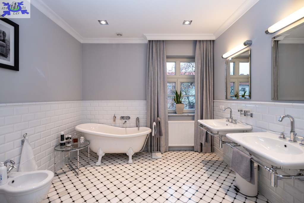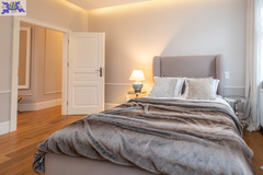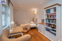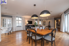 To wnętrze, które zachwyca dbałością o detal i ponadczasową klasą. Dominuje piękna, olejowana deska dębowa na podłogach, wysokie listwy przypodłogowe, sztukaterie ścienne i sufitowe, klasyczne proporcje pomieszczeń. Szaro-beżowa paleta barw przełamana głęboką zielenią i czernią, welurowe sofy, żyrandole w stylu glamour, kominek wolnostojący w salonie. Kuchnia otwarta na jadalnię w bieli i drewnie,. Łazienki wykończone marmurem i mozaiką w stylu retro (wanna wolnostojąca na lwich łapach, baterie w chromie).