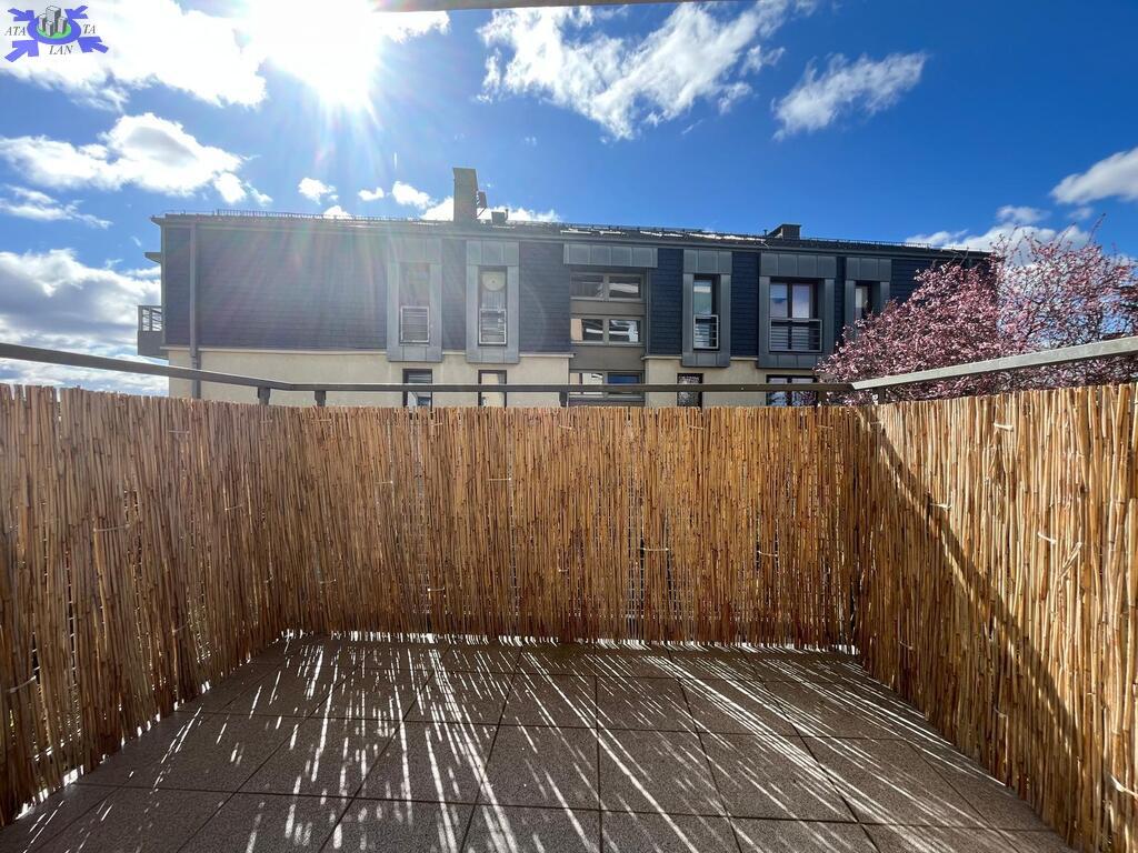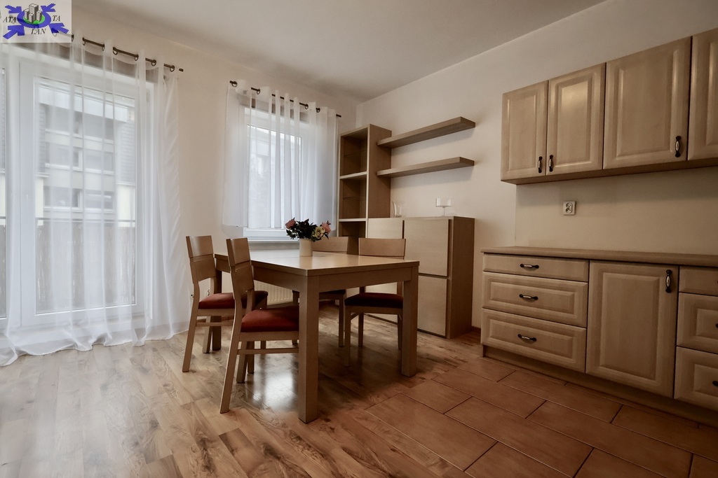 - Pokój umeblowany z kuchnią w aneksie i wyjściem na słoneczny balkon.