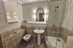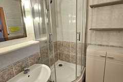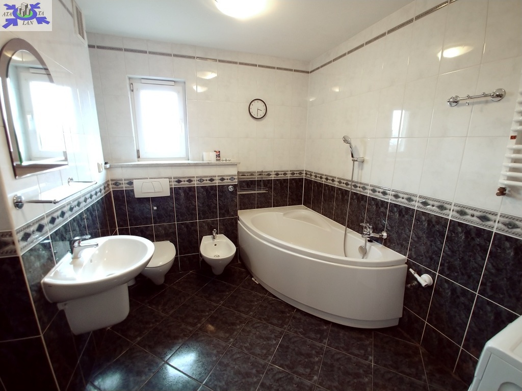 I poziom - 87 m2 kuchnia kompletnie umeblowana meblami na wymiar z pełnym wyposażeniem (lodówko-zamrażarka, kuchenka elektryczna, płyta grzewcza, zmywarka, pralka), mniejsza łazienka z kabiną prysznicową, pokój dzienny o pow. 24 m2 z balkonem oraz 2 niezależne pokoje o pow. 15 m2 każdy. W zabudowie szafy typu "komandor" - w przedpokoju oraz pokoju na górze.