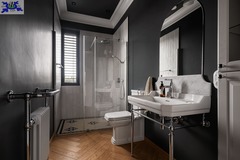 2 łazienki wykończone włoskim marmurem Carrara. Wyposażone w armaturę marek premium (Axor, Laufen, Burlington, Grohe) oraz wannę wolnostojącą. W łazience prysznicowej podłogę zdobią ręcznie wypalane płytki "Gorseciki Warszawskie" (autorski projekt).