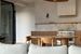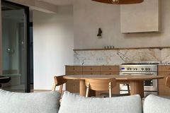 Kuchnia i Jadalnia Otwarta kuchnia z zabudową wykończoną naturalnym dębowym fornirem. Blaty, fartuch oraz dedykowane miejsce kawowe wykonano ze szlachetnego włoskiego marmuru Breccia Capraia.