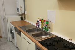 W kuchni 2 lodówki, dwie pralki, zmywarka, naczynia, garnki, sztućce.