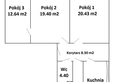 3 pokoje, kuchnia, 2 łazienki (jedna z wanną, druga z prysznicem).