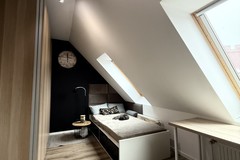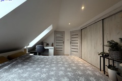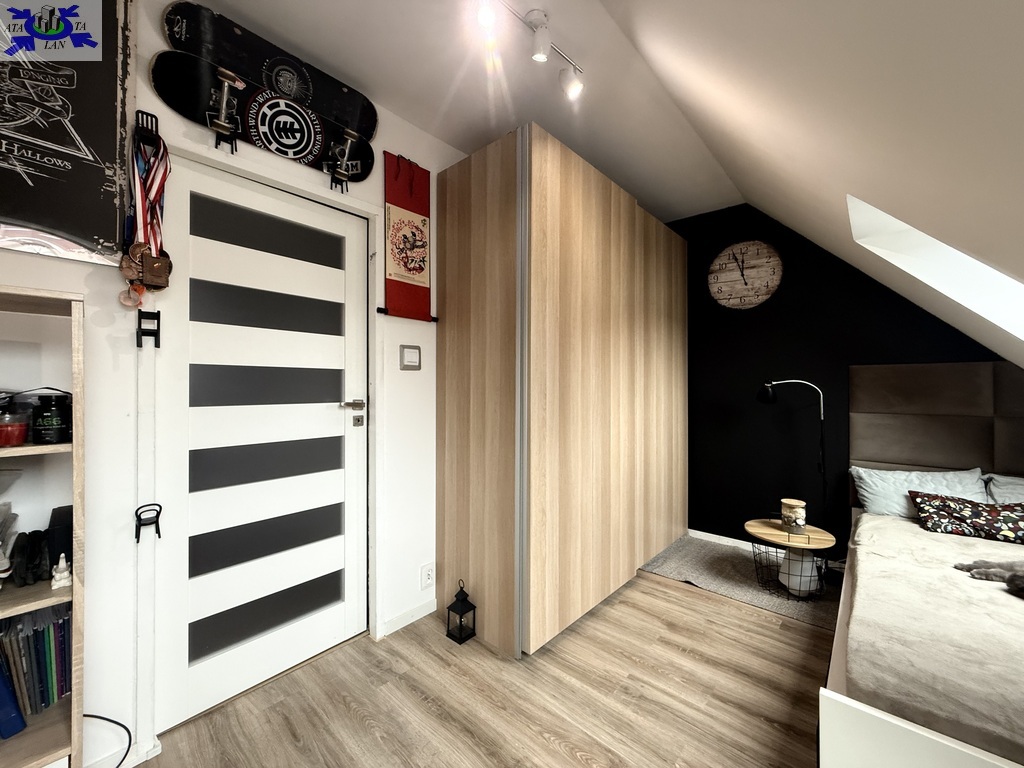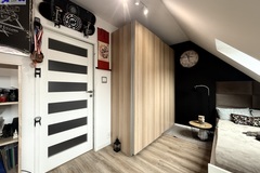 Na drugim piętrze znajduje się duża sypialnia z szeroką szafą i garderobą.