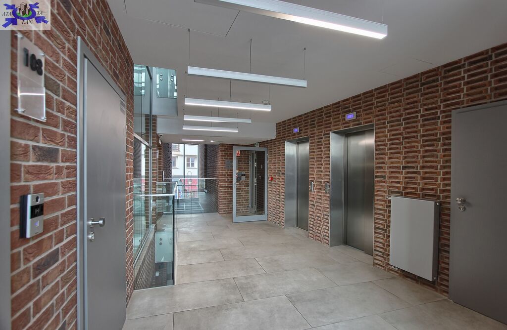 Budynek wykończony jest w wysokim standardzie, posiada monitoring, kontrolę dostępu, klimatyzację, rekuperację, 2 windy oraz 3 klatki schodowe.