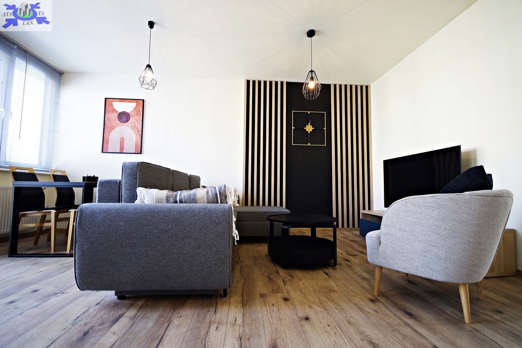 - Pokój 1- Salon o powierzchni ok. 30m2, wyposażony w stół jadalniany z krzesłami, narożny wypoczynek, komodę, telewizor, ściany gładzone, pomalowane. W salonie mamy wydzieloną strefę biurową uposażoną w biurko oraz fotel.
