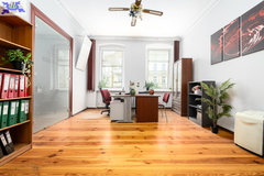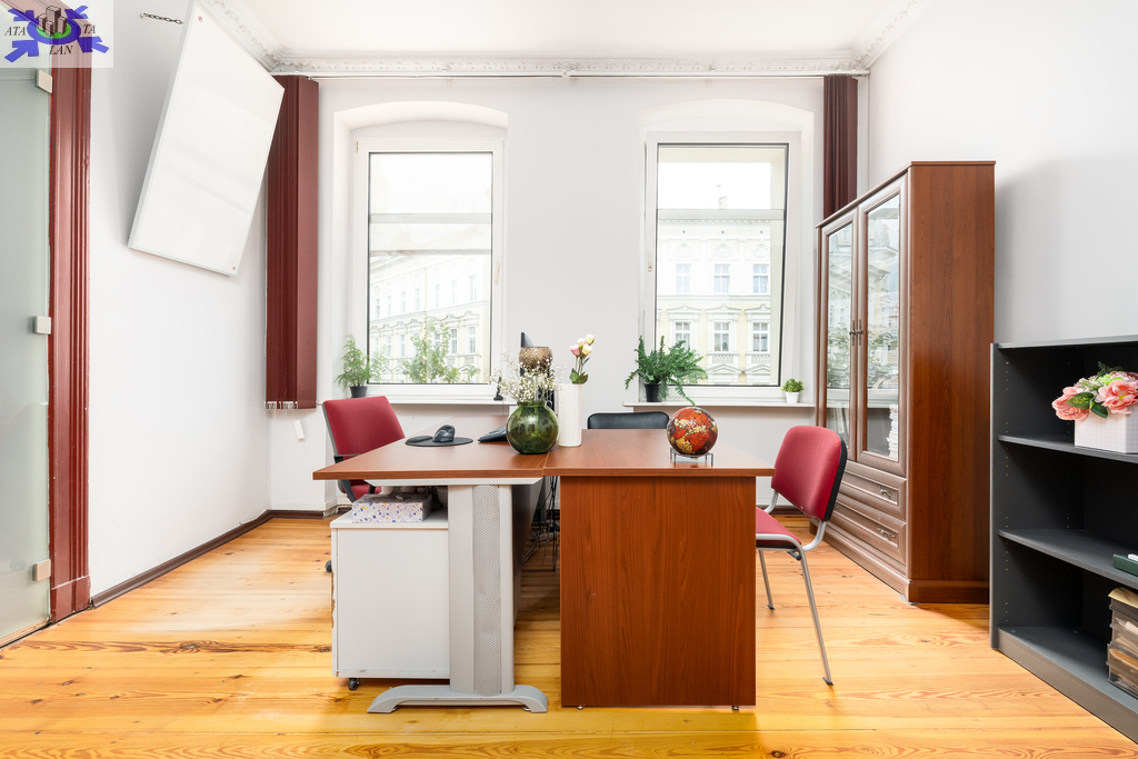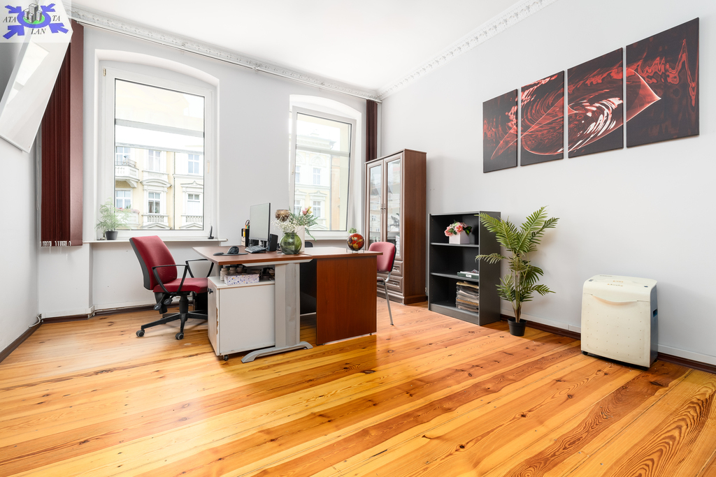 Strefa biurowa Dwa przestronne biura, idealne do prowadzenia działalności gospodarczej, dobrze doświetlone naturalnym światłem.Strefa mieszkalna Stylowa kawalerka z osobnym wejściem, przytulnym salonem z zielonymi kanapami i eleganckimi akcentami dekoracyjnymi.Kuchnia Nowoczesna, z pełnym wyposażeniem (lodówka, płyta indukcyjna, zmywarka) oraz eleganckim wykończeniem.Łazienka Wysokiej jakości wykończenie, komfortowa przestrzeń z nowoczesnymi urządzeniami.