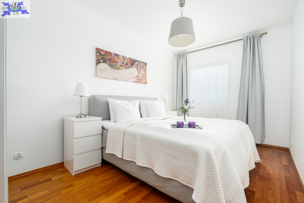 Sypialnie Dwie komfortowe, ustawne sypialnie, każda z dużymi oknami, które oferują piękne widoki. Wnętrza są jasne, co podkreśla elegancję i przytulność tych przestrzeni.