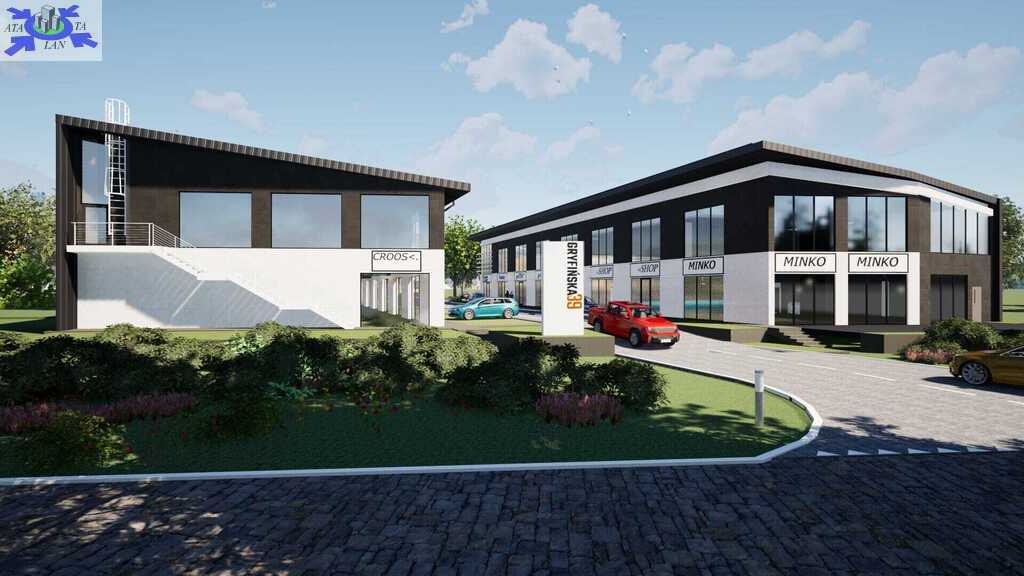 Na nieruchomości zaprojektowano dwa nowoczesne budynki usługowo-magazynowe z reprezentacyjnymi przeszkleniami, możliwością ekspozycji i dogodnym dojazdem.