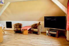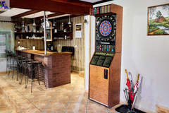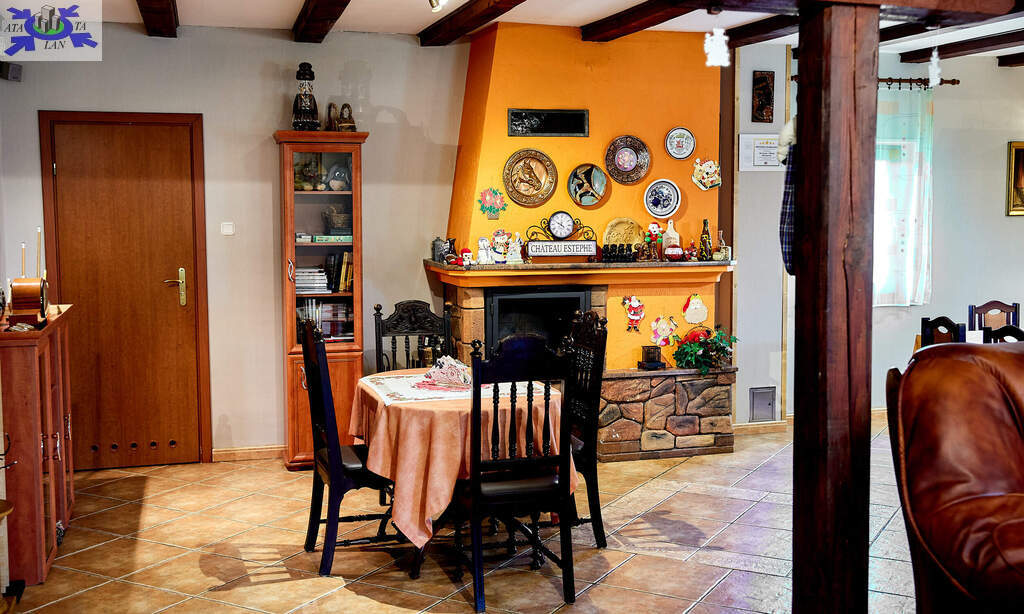 salon - pokój dzienny o pow. ok. 85 m2 wyposażony w niezbędne do wypoczynku mieszkańców i spędzania wspólnego czasu meble, automat do gry w darta (lotki) oraz klimatyczny kominek,
