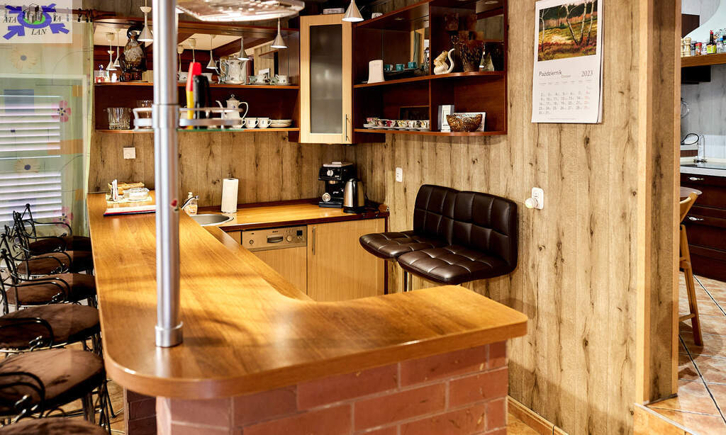 kącik barowy (ok. 5 m2) wyposażony w stylowe stołki barowe (hokery), niezbędne meble i sprzęty (m. in. lodówka, zmywarka),