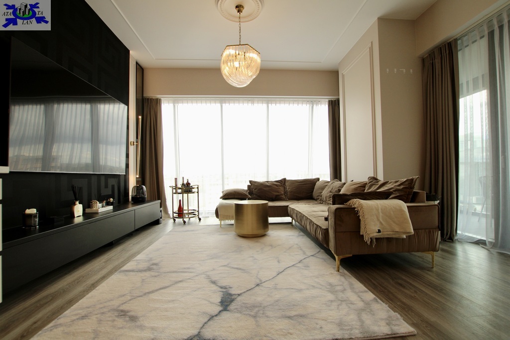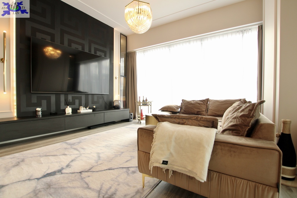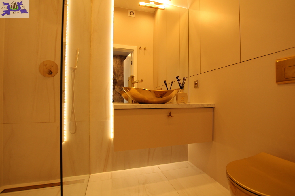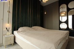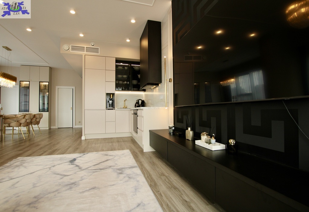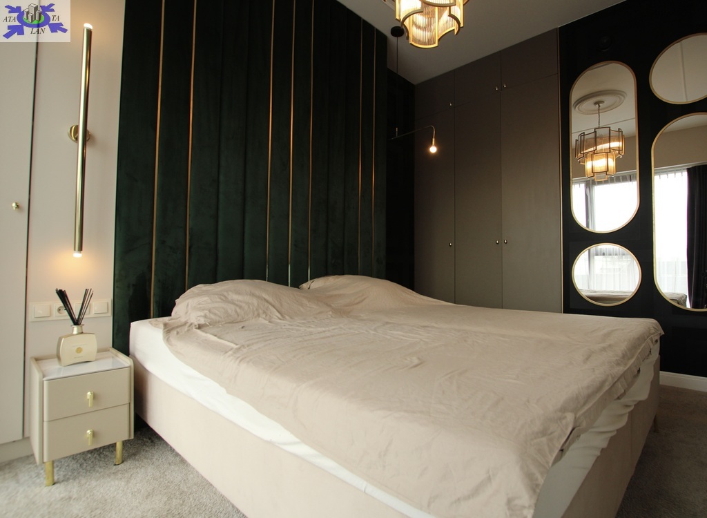 Wnętrze apartamentu zaprojektowano w stylu nowoczesny glamour z nutą art dco z najwyższej jakości materiałów - aksamitne tkaniny, złote wykończenia, naturalne drewno i designerskie oświetlenie oraz stylowe tapety tworzą wyjątkową całość. Każdy element ma tu swoje miejsce - nieprzypadkowy i dopracowany.