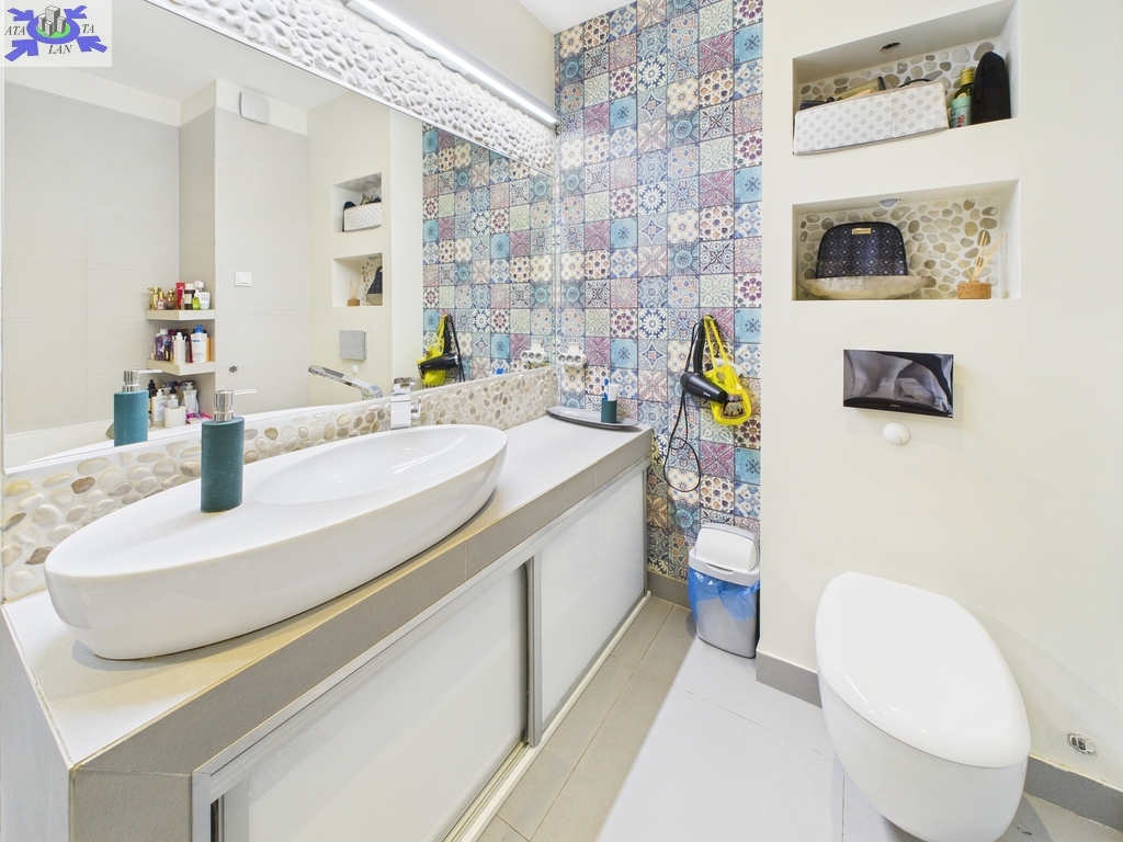 * Duża łazienka wyposażona w wannę, WC oraz dużą umywalkę