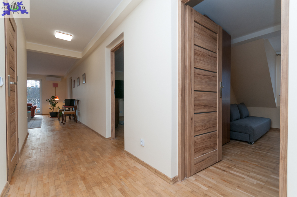 Trzy osobne sypialnie, centralny salon z kominkiem i wyjściem na balkon. Klimatyzacja zamontowana zarówno w salonie jak i sąsiadującej sypialni. Wygodna łazienka z kabiną prysznicową. Widna kuchnia z meblami w zabudowie, zmywarka, pralka, piekarnik. Mieszkanie z wystawią okien wschód-południe-zachód.
