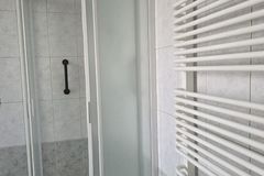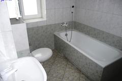 Łazienka z WC, wyposażona w umywalkę, wannę i kabinę prysznicową, w glazurze i terakocie.