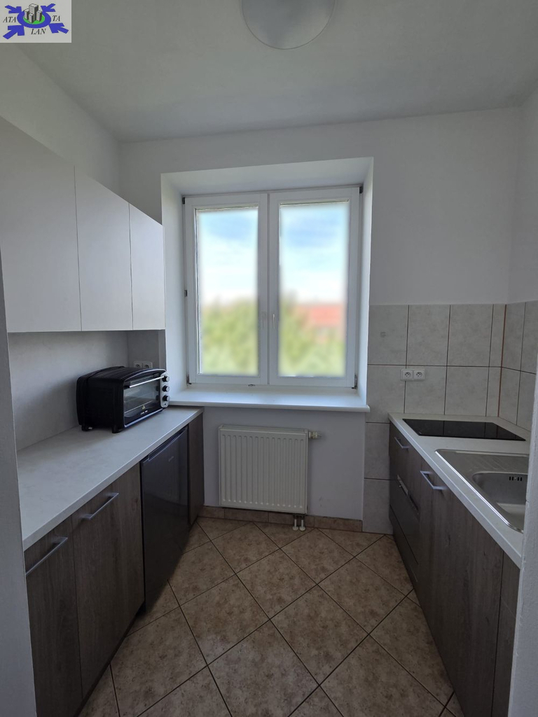 Kuchnia osobna, widna, z oknem, wyposażona w meble w zabudowie i sprzęt AGD (lodówka, piekarnik, zmywarka), na podłodze kafle.