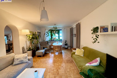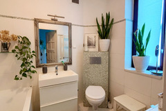 parterhall, salon, 2 pokoje, osobna kuchnia z wyjściem na przetronny taras, łazienka z kabiną prysznicową z WC,