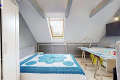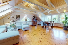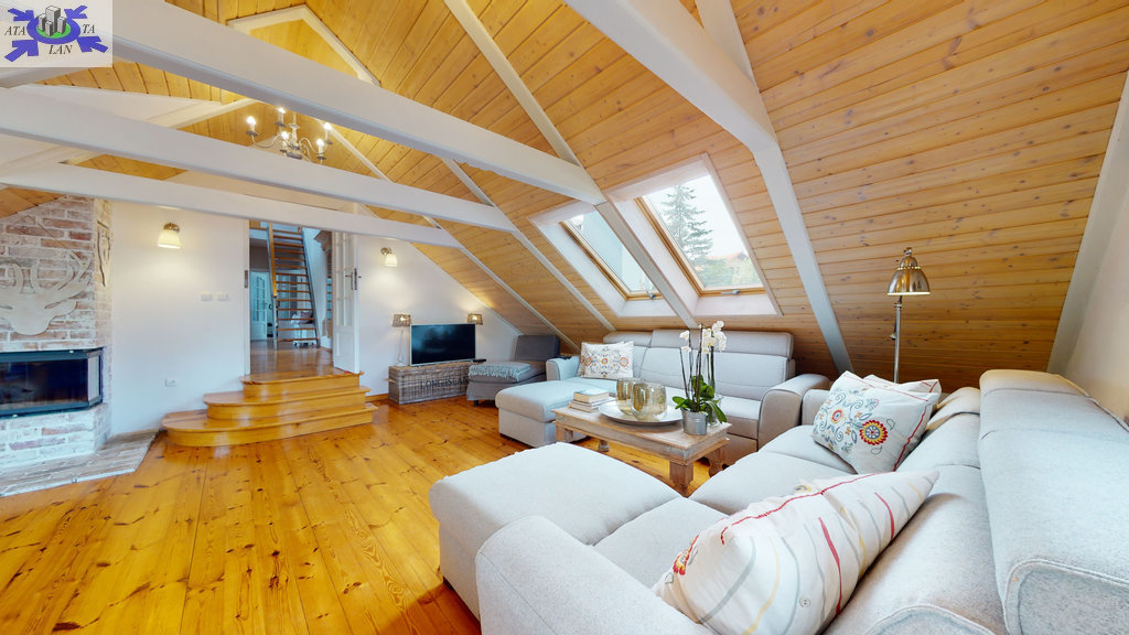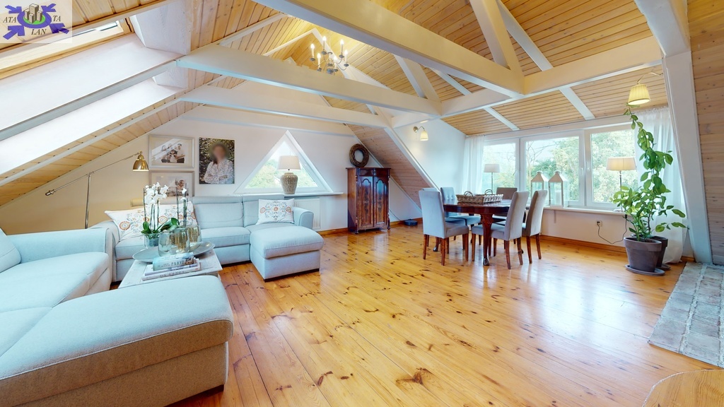 Część mieszkalną o powierzchni użytkowej 103,99 m2, znajdującą się na piętrze i poddaszu tworzą