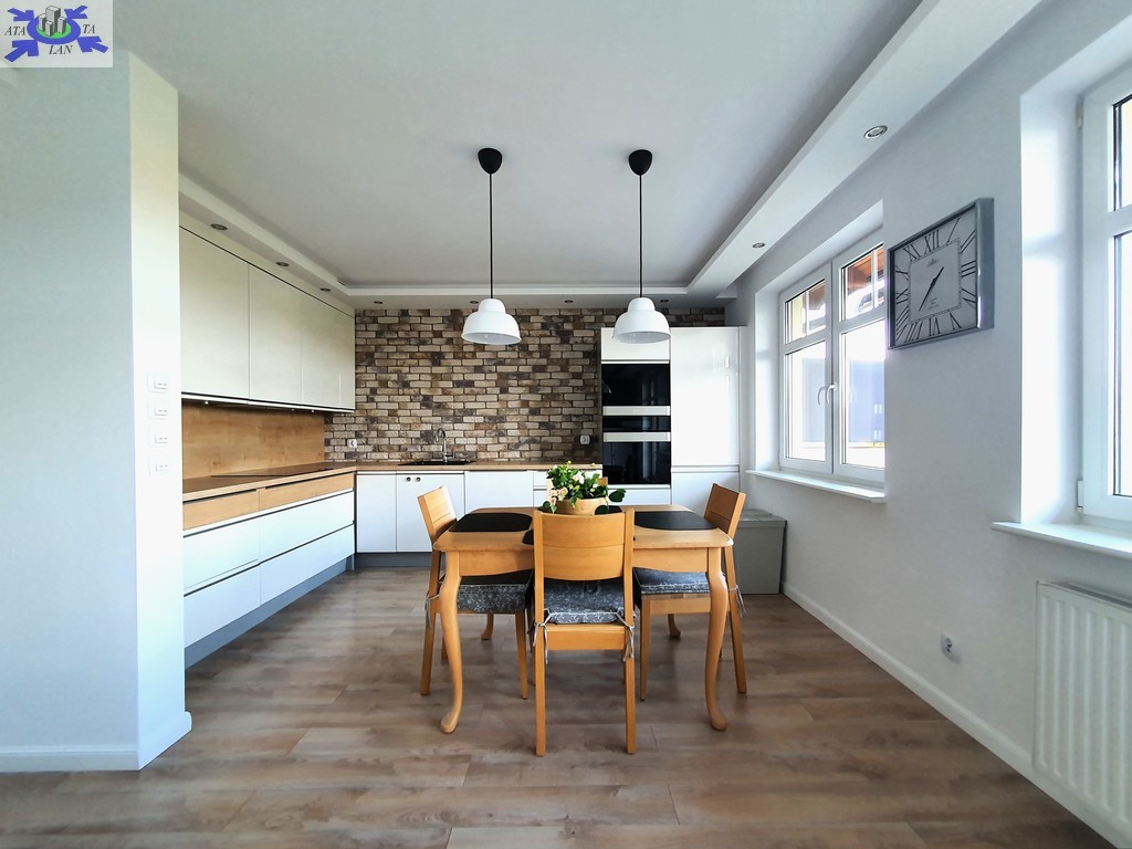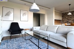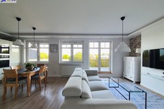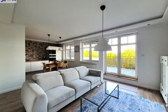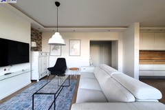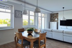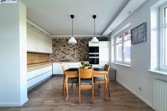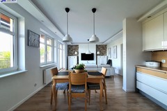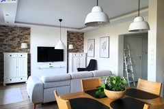 - przestronnego salonu z aneksem wyposażonego w wysokiej klasy sofę z funkcją relaks, TV LCD Samsung, funkcjonalne komody, fotel i stolik kawowy. Pomieszczenie jest bardzo przestronne, doświetlone przez dwa bardzo duże okna oraz drzwi podwójne balkonowe wyposażone w elektrycznie sterowane rolety antywłamaniowe. Aneks posiada zabudowę na wymiar, a na wyposażeniu markowe sprzęty AGD (lodówko-zamrażarka, piekarnik, płyta indukcyjna, zmywarka). Między aneksem a salonem znalazło się również miejsce na stół jadalniany z czterema krzesłami. Na wyposażeniu kuchni znajdziemy kubki, szklanki, zastawę stołową, sztućce, garnki itp.