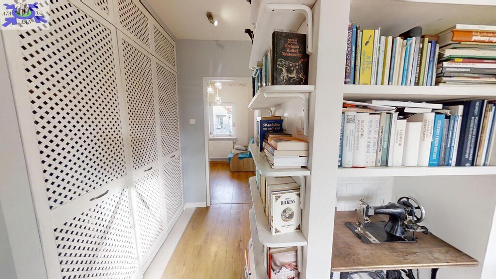 Mieszkanie pierwotnie było dwupokojowe - w chwili obecnej przystosowane przez architekta do potrzeb rodziny 4-osobowej. Jeden z pokoi został przedzielony lekką ścianką z płyt g-k, niewielkim nakładem kosztów można powrócić do stanu pierwotnego. Mieszkanie zaprojektowane z dbałością o ergonomię i zachowanie poczucia przestronności w korytarzach szafy, wykorzystujące całą wysokość pomieszczeń, aranżacja kuchni oparta na wygodnym systemie szufladowym. Specjalnie zaprojektowany układ ścian mieści z jednej strony biblioteczkę, z drugiej - szafę gospodarczą.