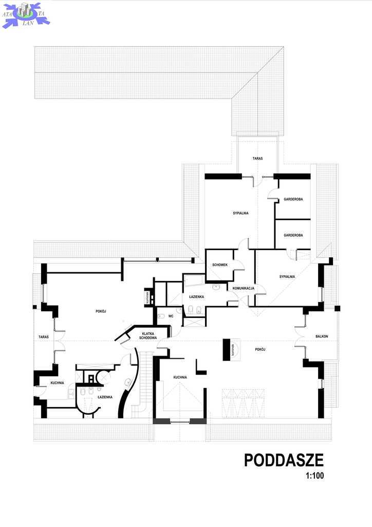 - wyodrębnione mieszkanie doświetlone oknami tarasowymi i połaciowymi z kuchnią (16,5m2), salon z tarasem (36,3m2), dwie sypialnie oraz łazienka (całe to mieszkanie ma powierzchnię 120m2)
