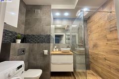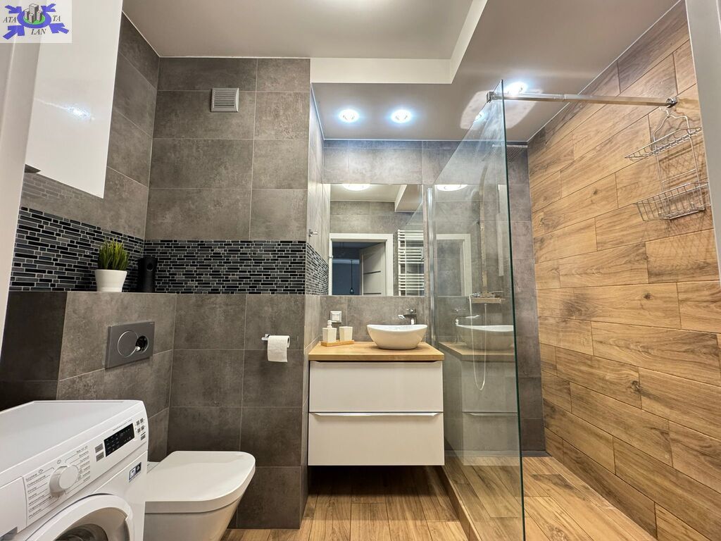 Łazienka gustownie wykończona, wyposażona w kabinę prysznicową, umywalkę, wc.