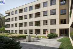 Piękna architektura budynku z nowoczesnym loggie zamiast balkonu, zagospodarowany, zielony teren z ogólnodostępnym dziedzińcem.