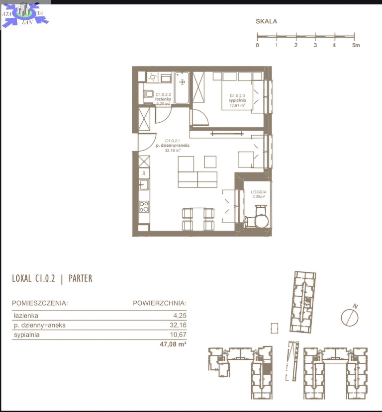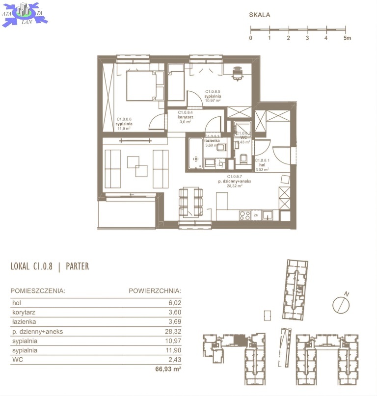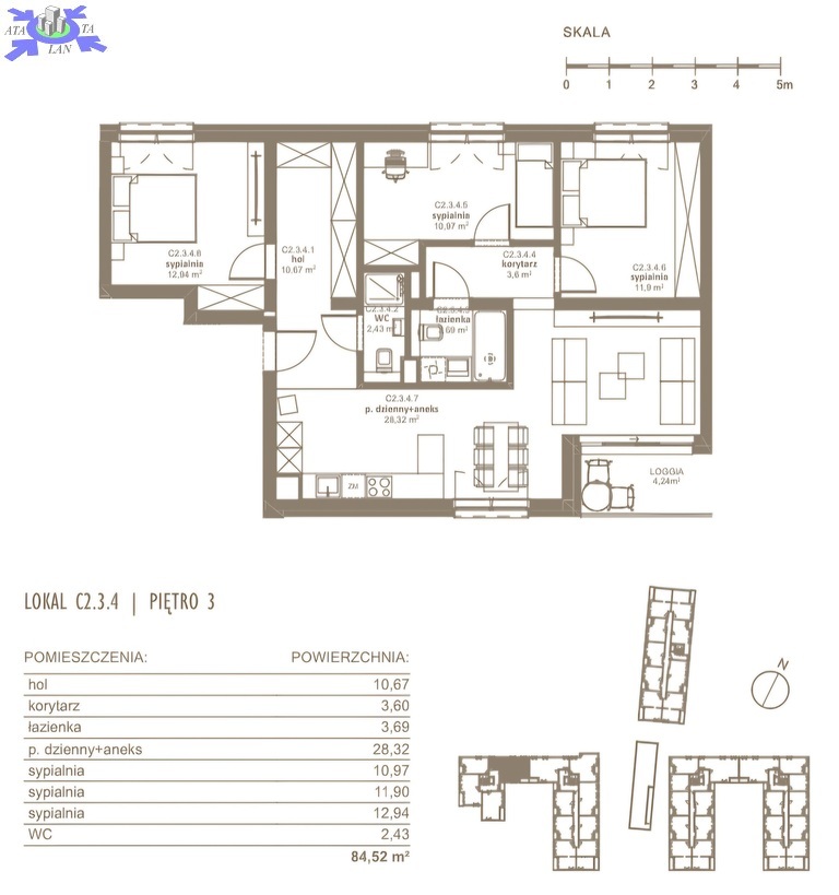 - Układ pomieszczeń salon z aneksem kuchennym z wyjściem na loggie, 3 sypialnie, łazienka, hol, korytarz
