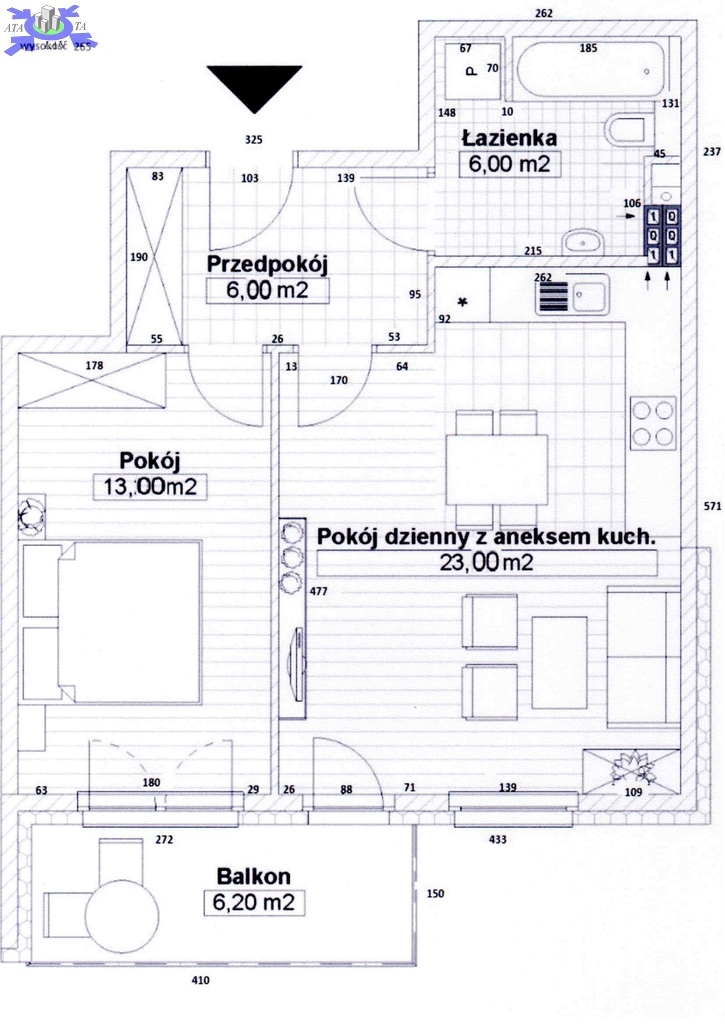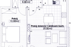 Układ salon z aneksem + sypialnia + łazienka + przedpokój