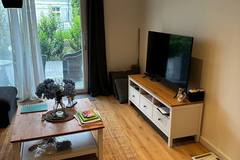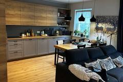 Przestronny salon z aneksem kuchennym (pełne wyposażenie meble, płyta, piekarnik, lodówka, zmywarka)