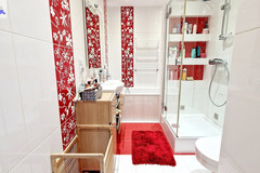 łazienka na piętrze wyposażona zarówno w wannę, jak i prysznic,