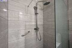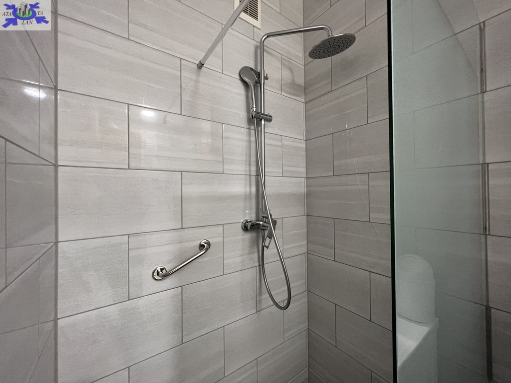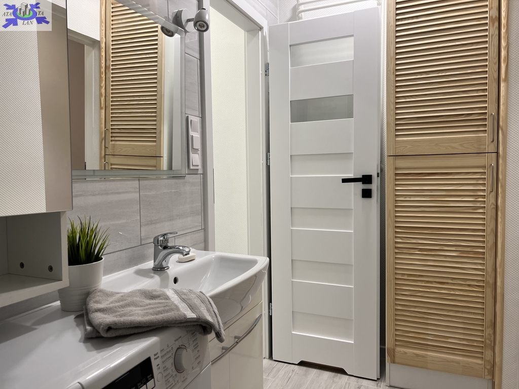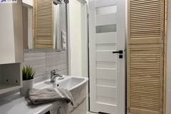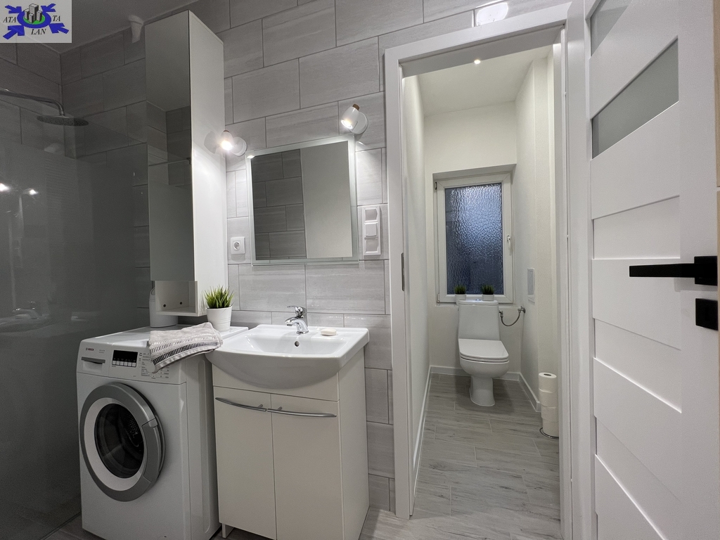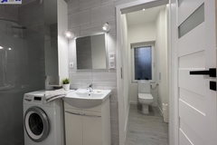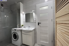 Łazienka z kabiną prysznicową oraz toaletą oddzieloną drzwiami. W łazience znajduje się nowy piec gazowy oraz pralka.