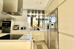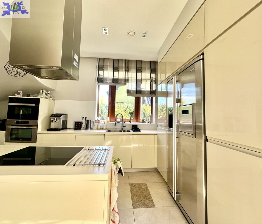 -otwarta kuchnia z oknem, pełna zabudowa meblowa oraz sprzęt AGD (płyta indukcyjna, piekarnik, mikrofala, lodówka side-by-side z kostkarką, krajalnica i inne),